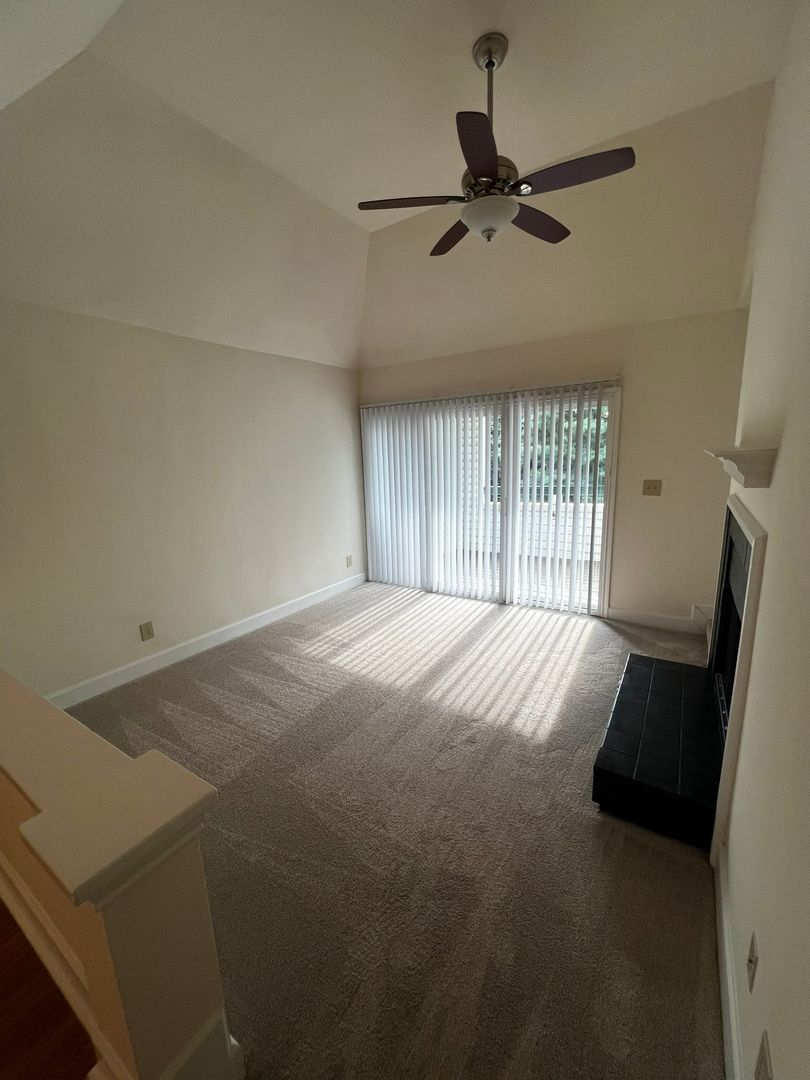 Top Floor Apartment with Matching White Appliances and Vaulted Living Room Ceilings